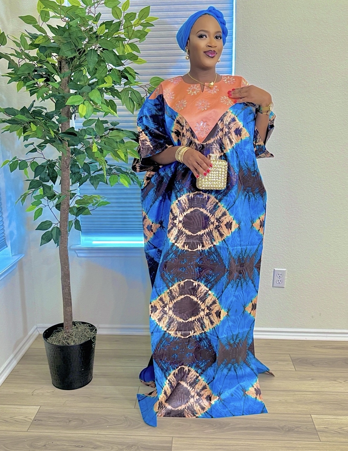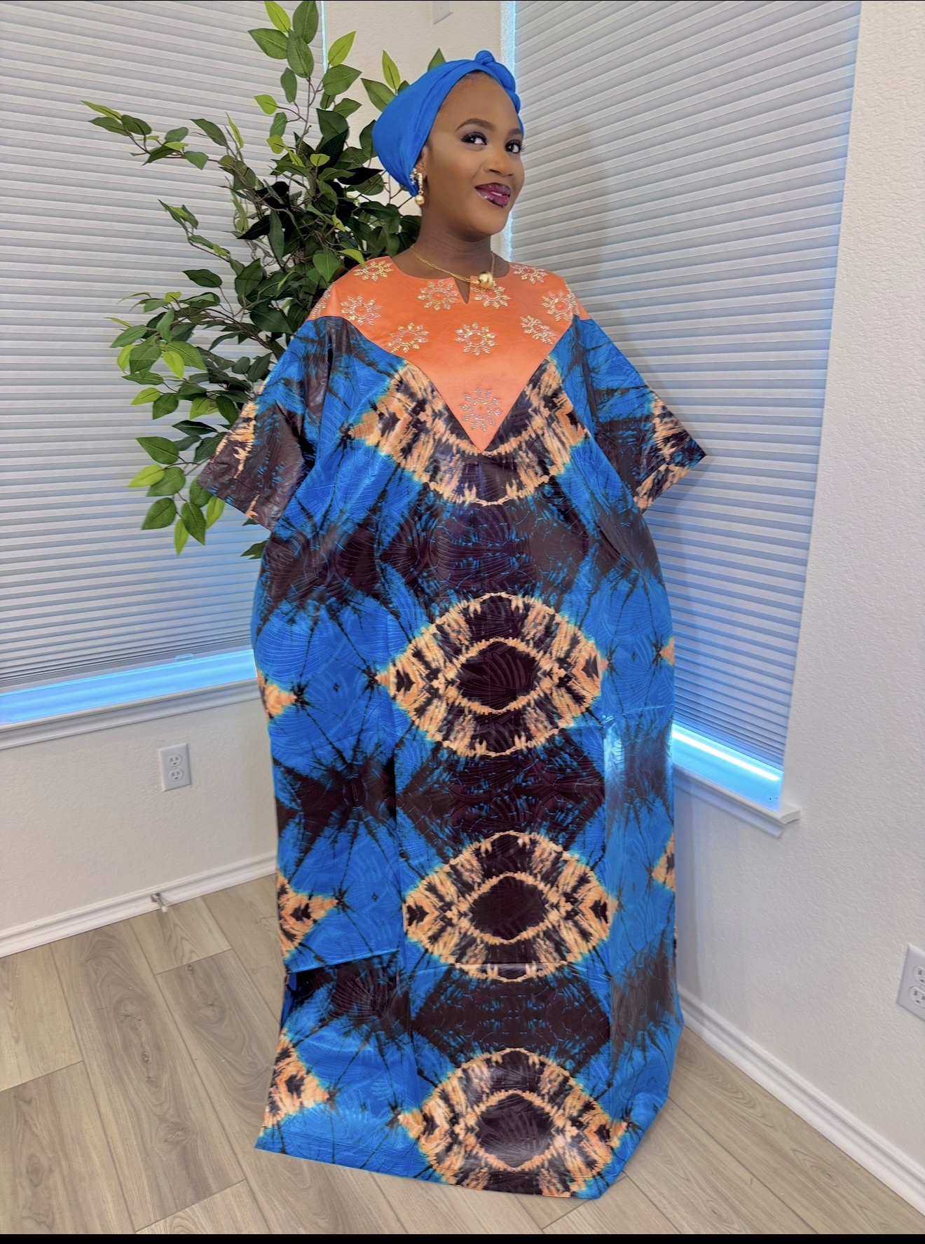 Adire Bubu Dress. Premium Kampala fabric . One-size fits all, it’s come with matching scarf and two side pockets. Length: 64in