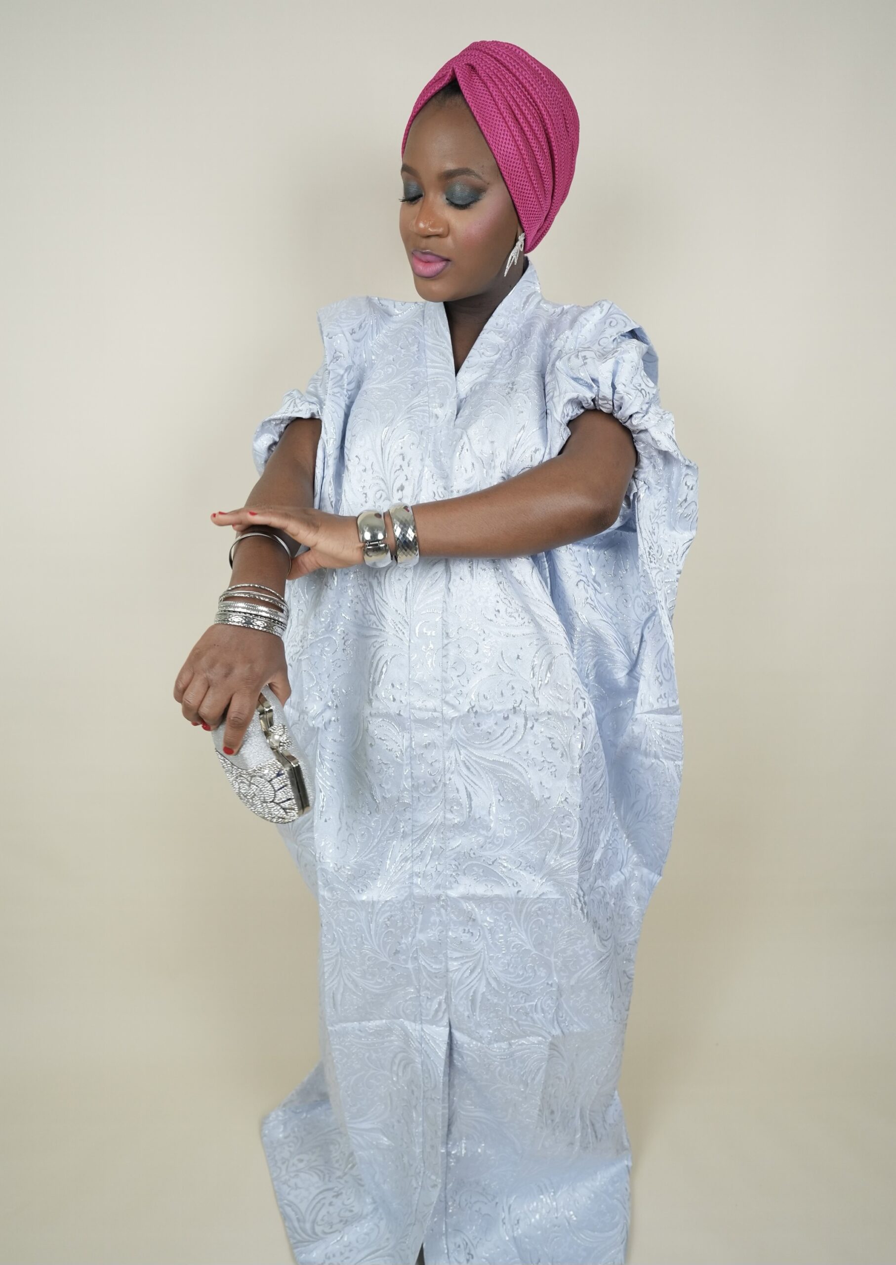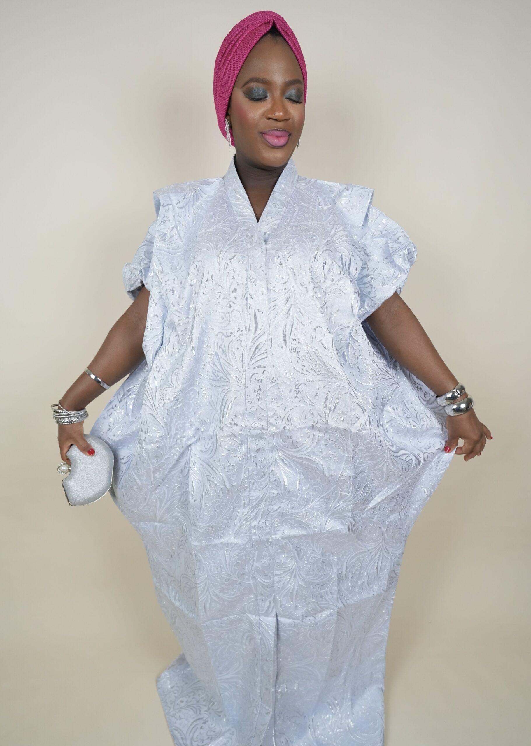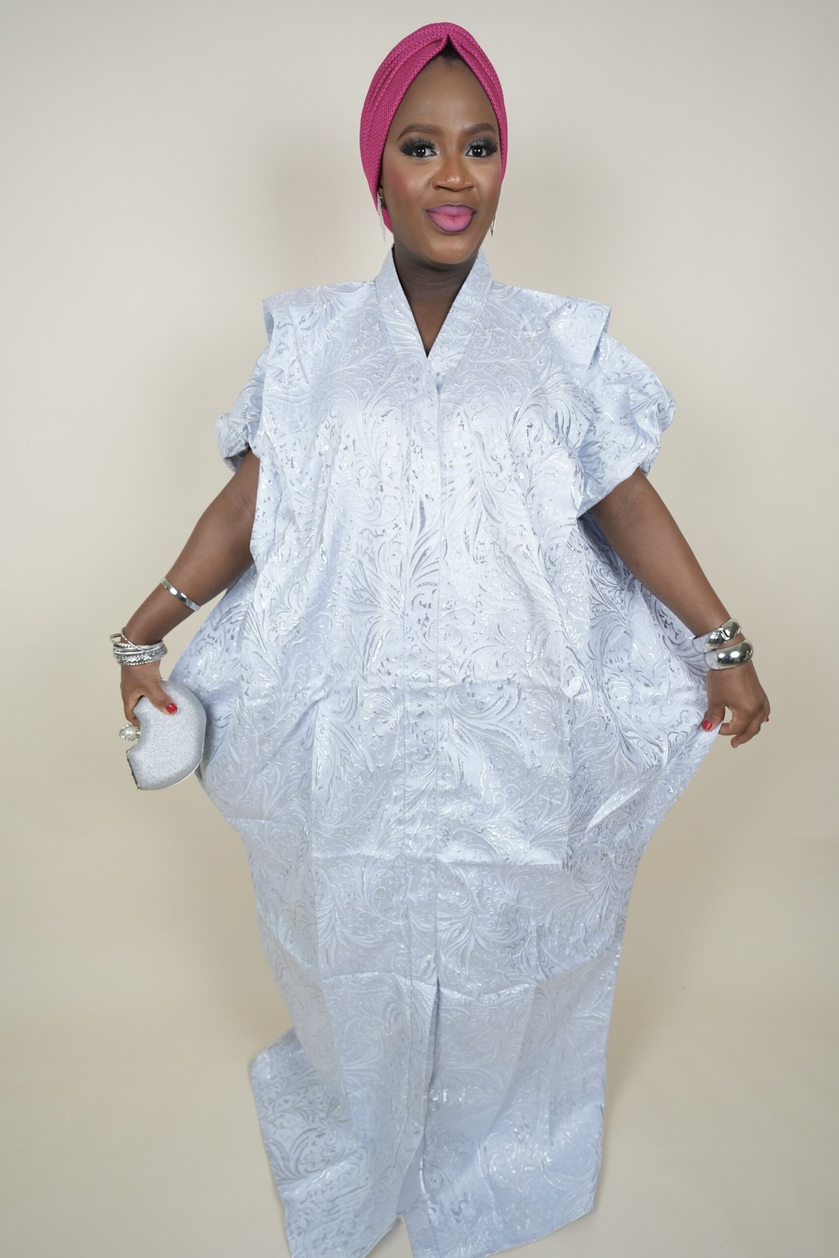 Premium Brocade Bubu Dress. Handmade from premium Damask Brocade. One-size fits all, comes in white and pink.It includes matching scarf and inner adjustable belt. Length: 64in.